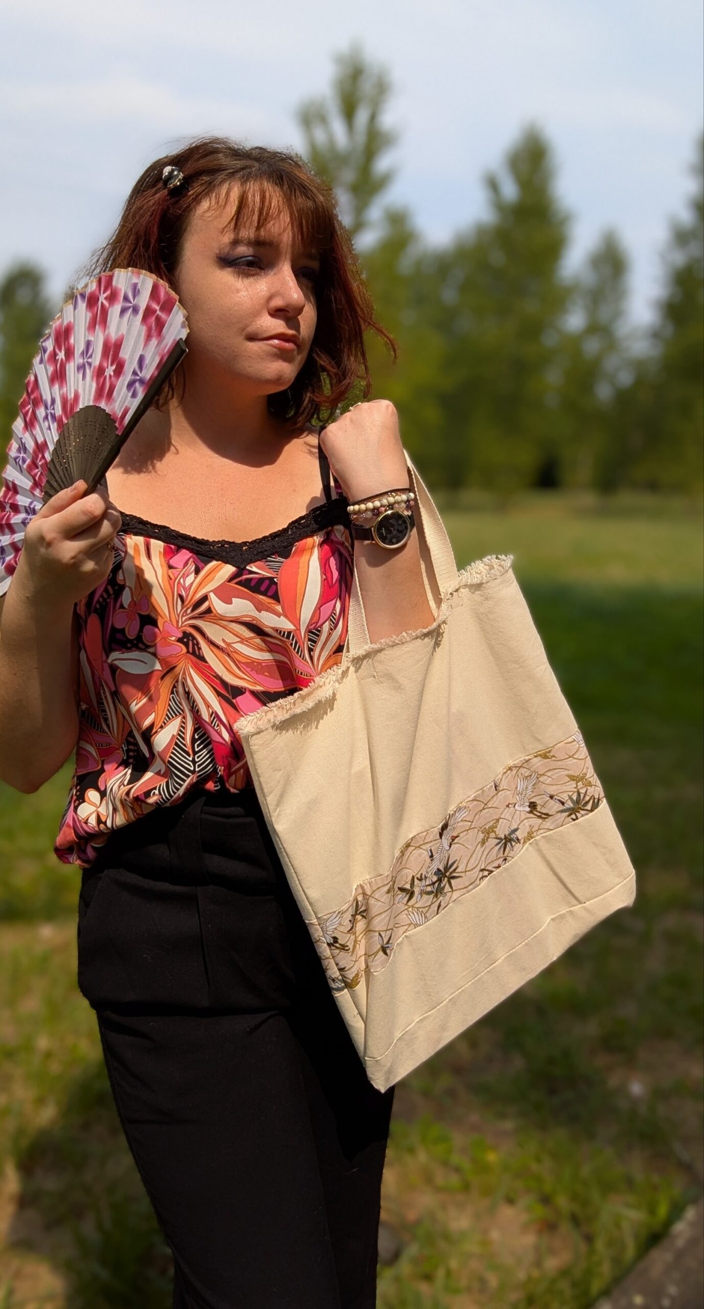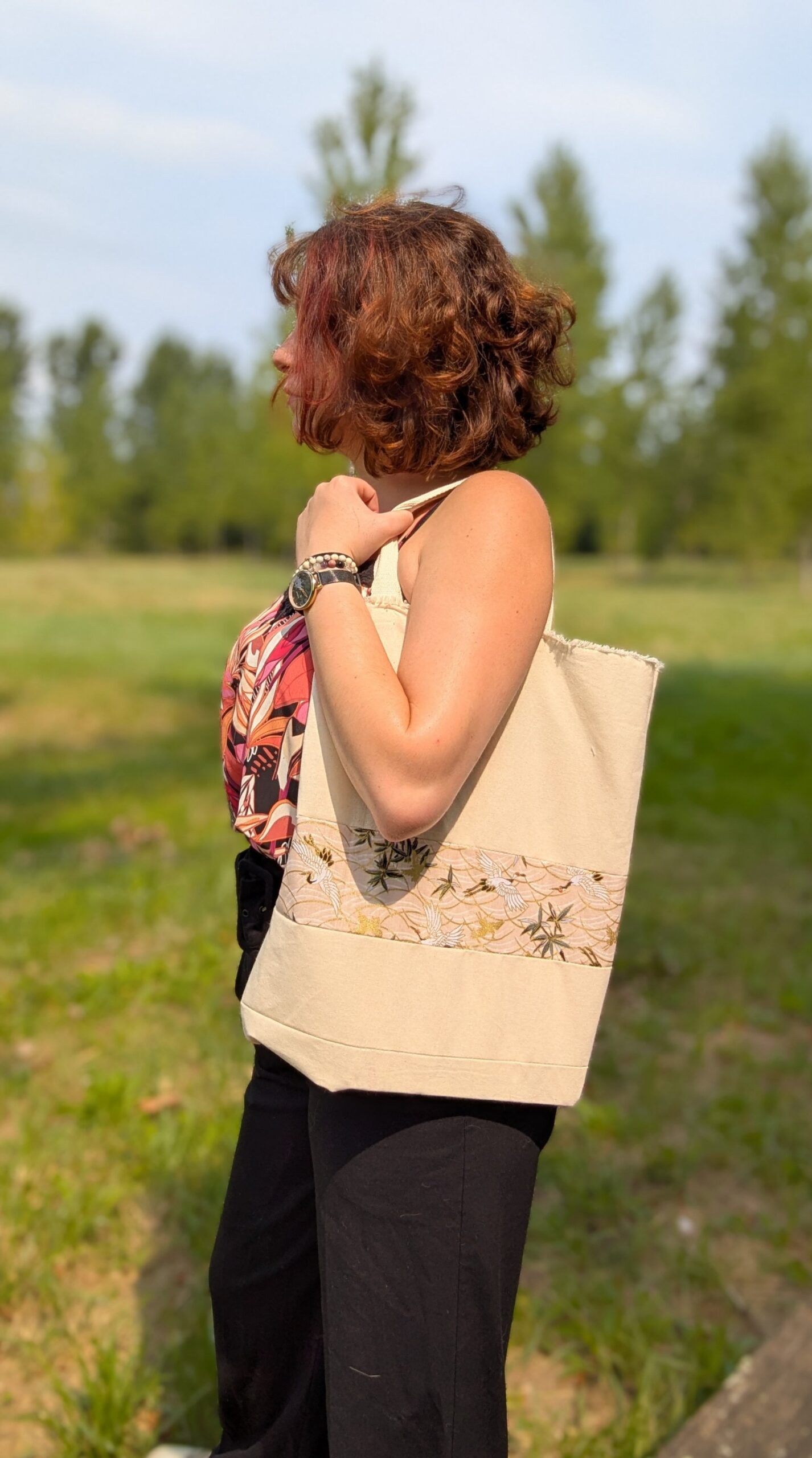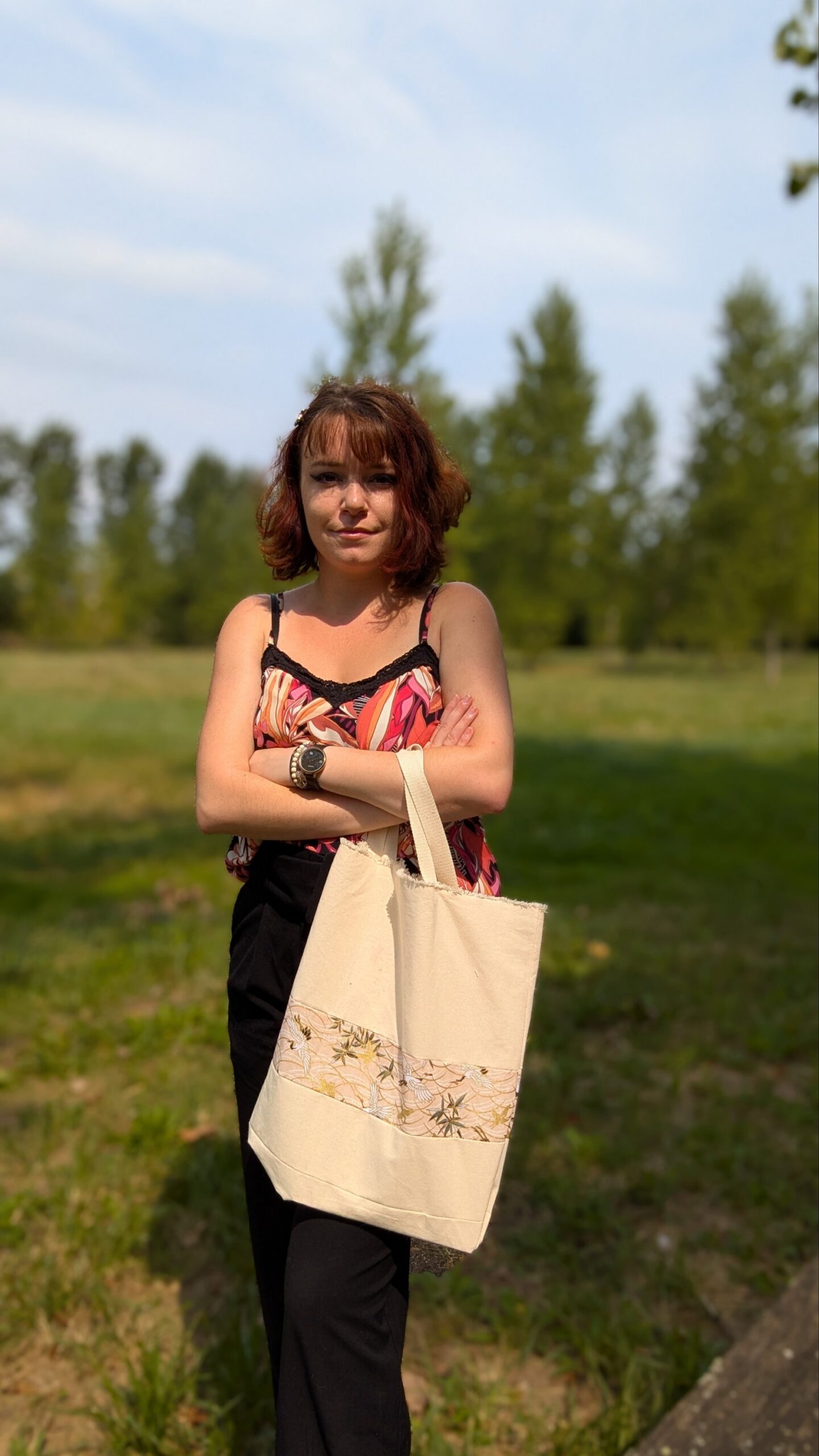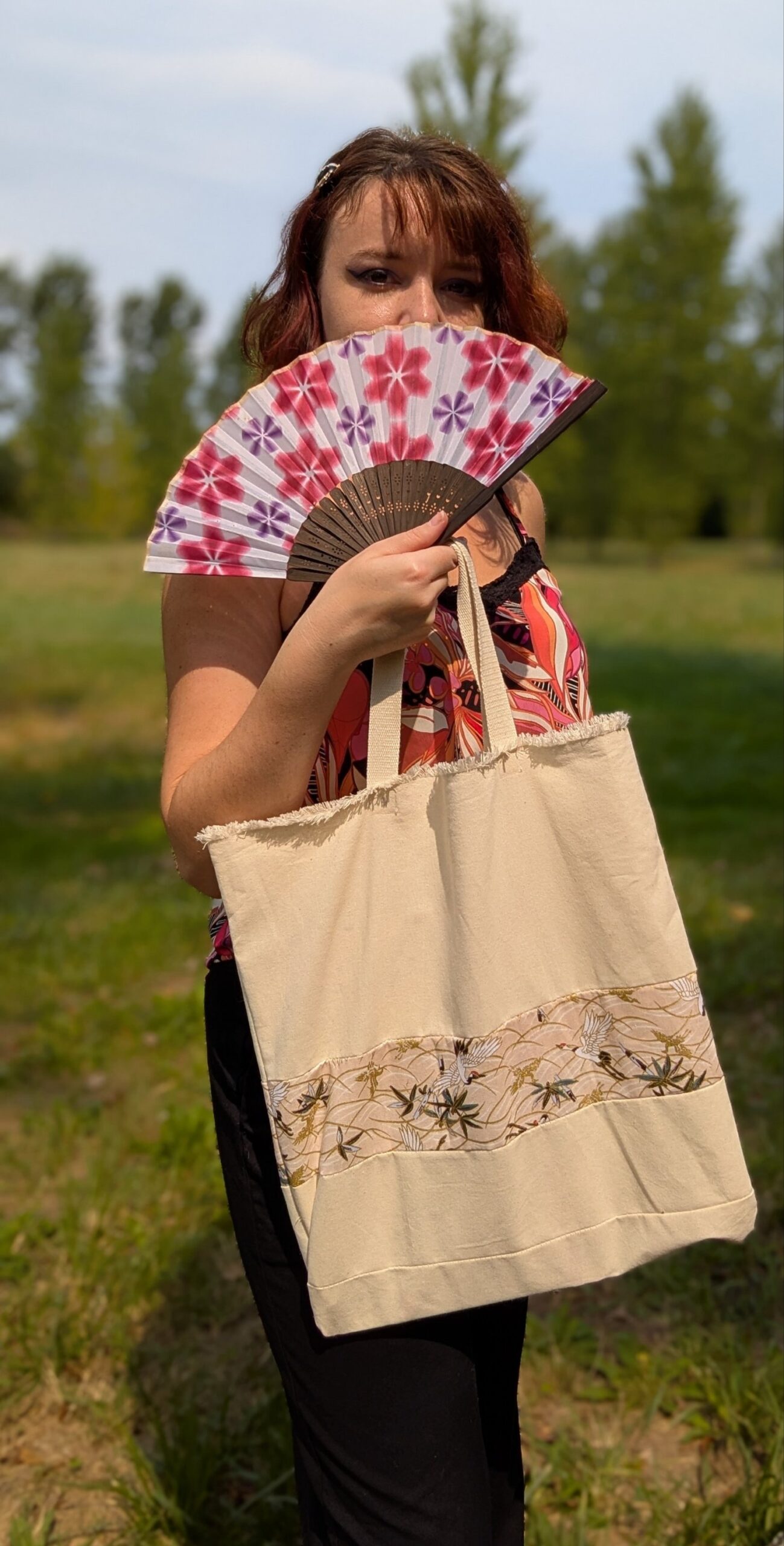 Shiroi Yuki vous fabrique également des Tote Bag avec ses imprimés japonais. Ici, des grues et des dorures discrètes sur un sac entièrement en coton, écoresponsable et pratique avec sa capacité de 40cmx40cm et un fond d’une largeur de 10cm.